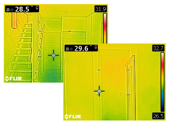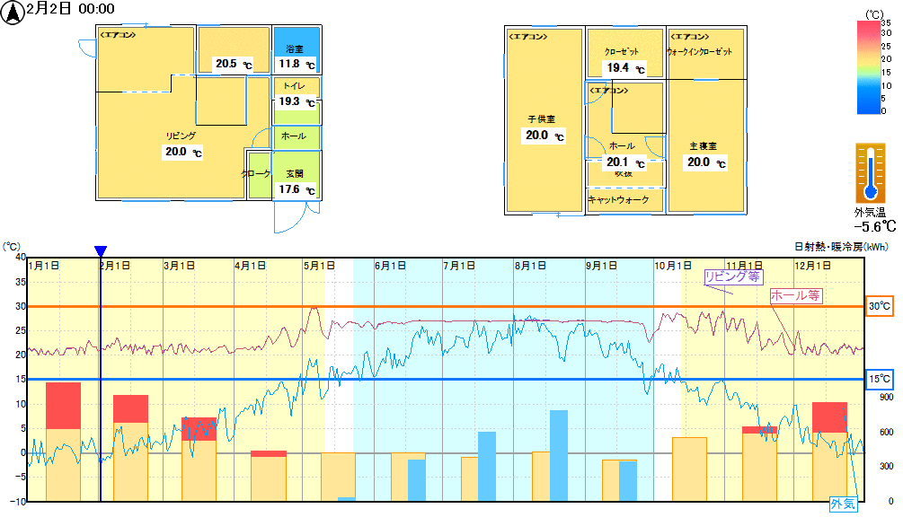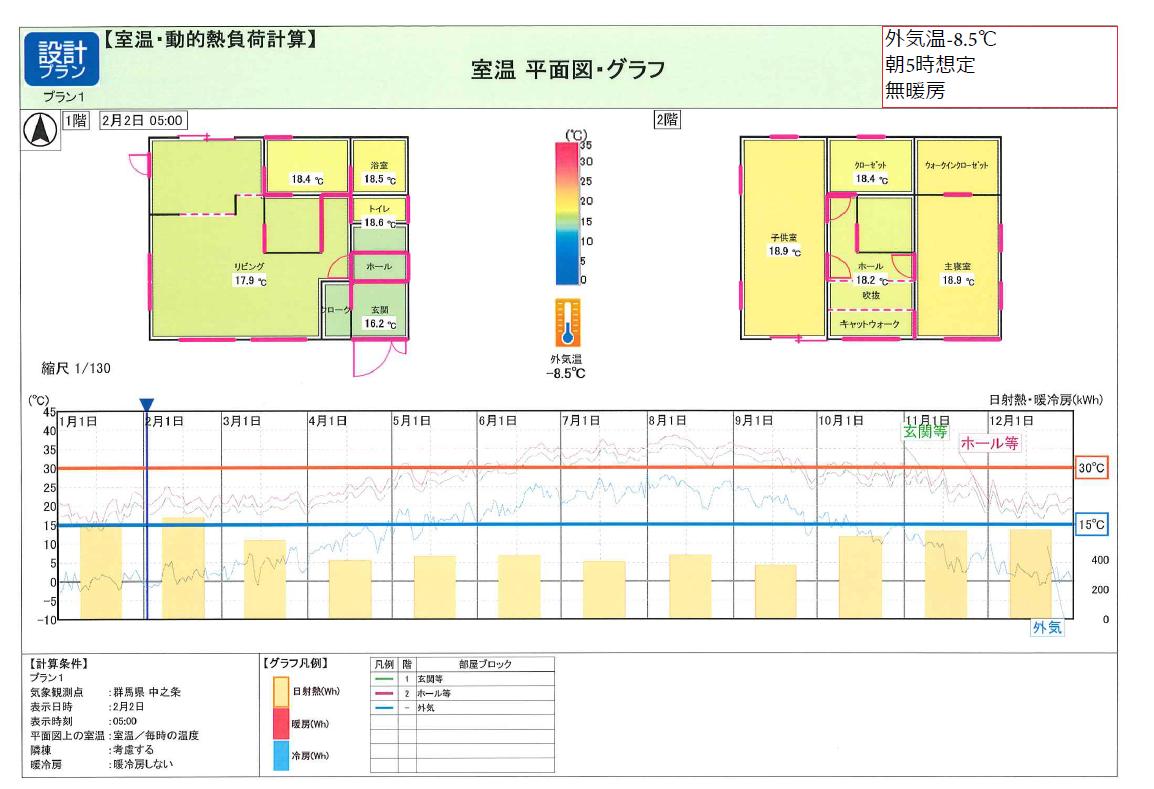 間取りが決まったら、24時間365日の部屋温度を無暖房で一度見える化。玄関及びサッシの仕様・位置などの最終確認を行いながら、冷暖房機器の能力選定や配置も確認します。