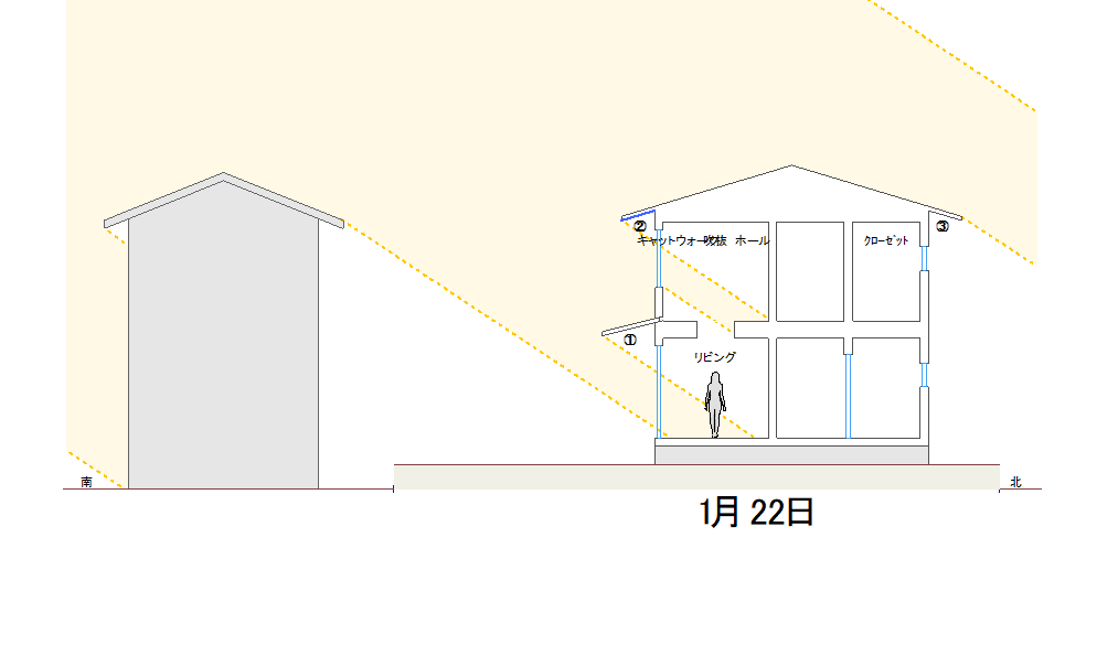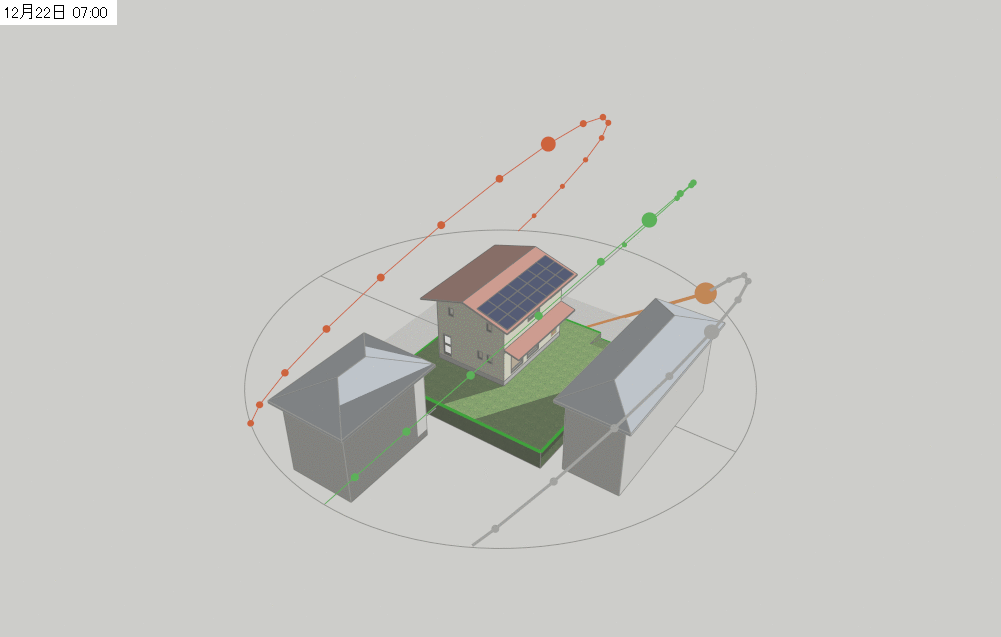 隣地や庇(ひさし)の影響を考え、室内への日射の取り入れ方を見える化。太陽の高さが大きく変わる夏と冬での各部屋の日射を確認できます。 冬の日射取得で暖房コストを削減し、夏の日射は防止して冷房効率をUPします。