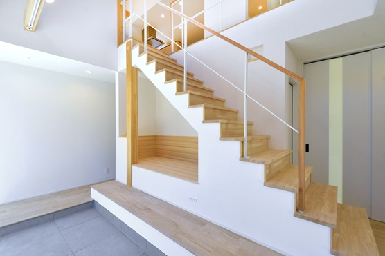 直接外気が侵入しないように風除室を設け、日射取得の為の大きな窓を南側に設置し、熱を蓄熱する土間タイル。