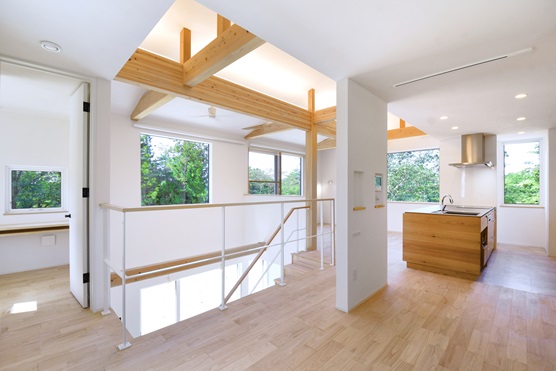 室内から眺望をよくする為に大きな窓を多数に設置したが、窓面積が大きいと熱損失が大きいので付加断熱してカバー。